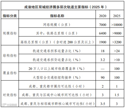 《规划》指出,到2025年,初步建成轨道上的成渝地区双城经济圈,进出川渝四向通道基本形成,形成功能清晰、布局合理的设施“一张网”,点线协调、衔接高效的枢纽“零换乘”,客货并重、联程联运的运输“一体化”。轨道交通总规模达到1万公里以上,其中铁路网规模达到9000公里以上、覆盖全部20万以上人口城市,形成重庆、成都都市圈1小时通勤圈,实现重庆、成都“双核”间1小时通达,“双核”与成渝地区区域中心、主要节点城市1.5小时通达,与主要相邻城市群核心城市约3小时通达。