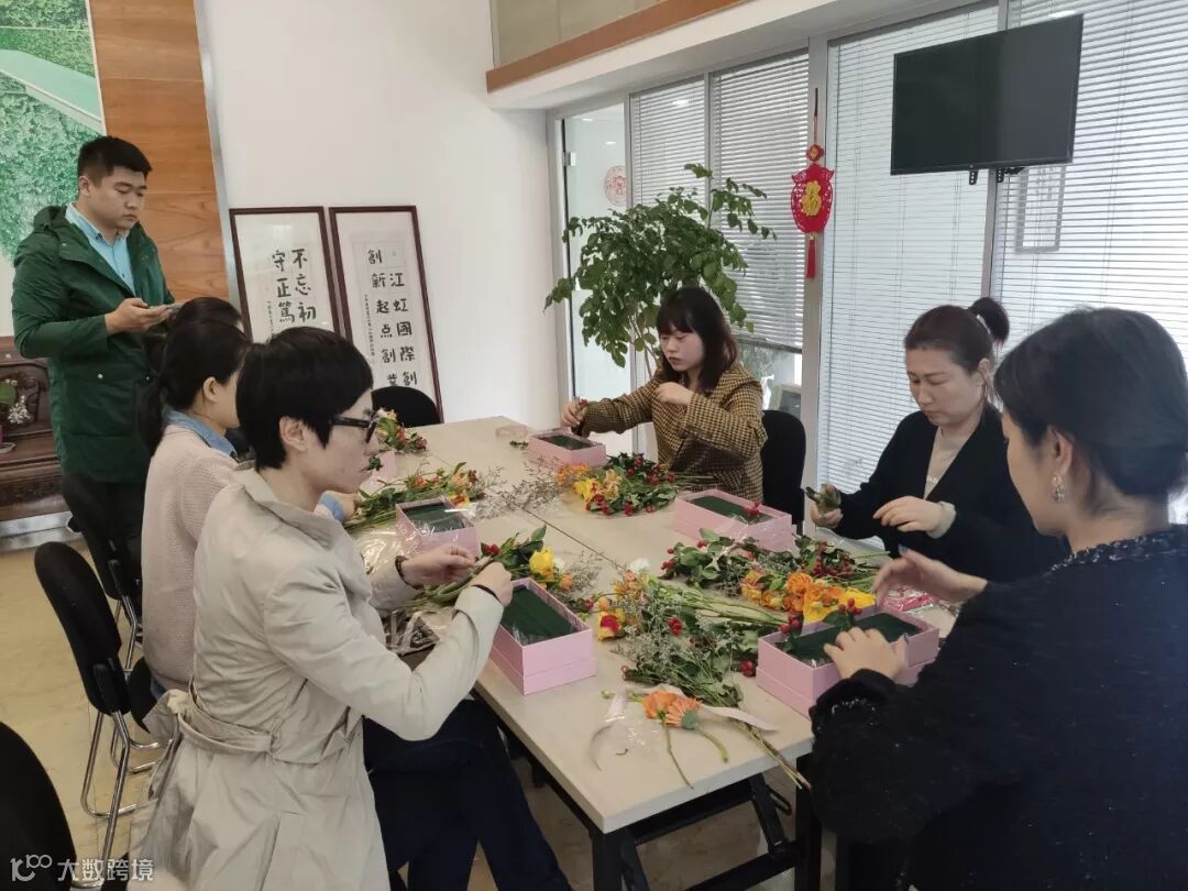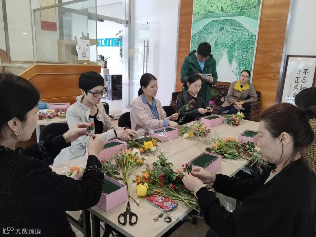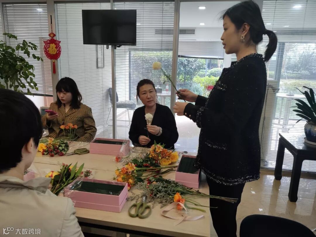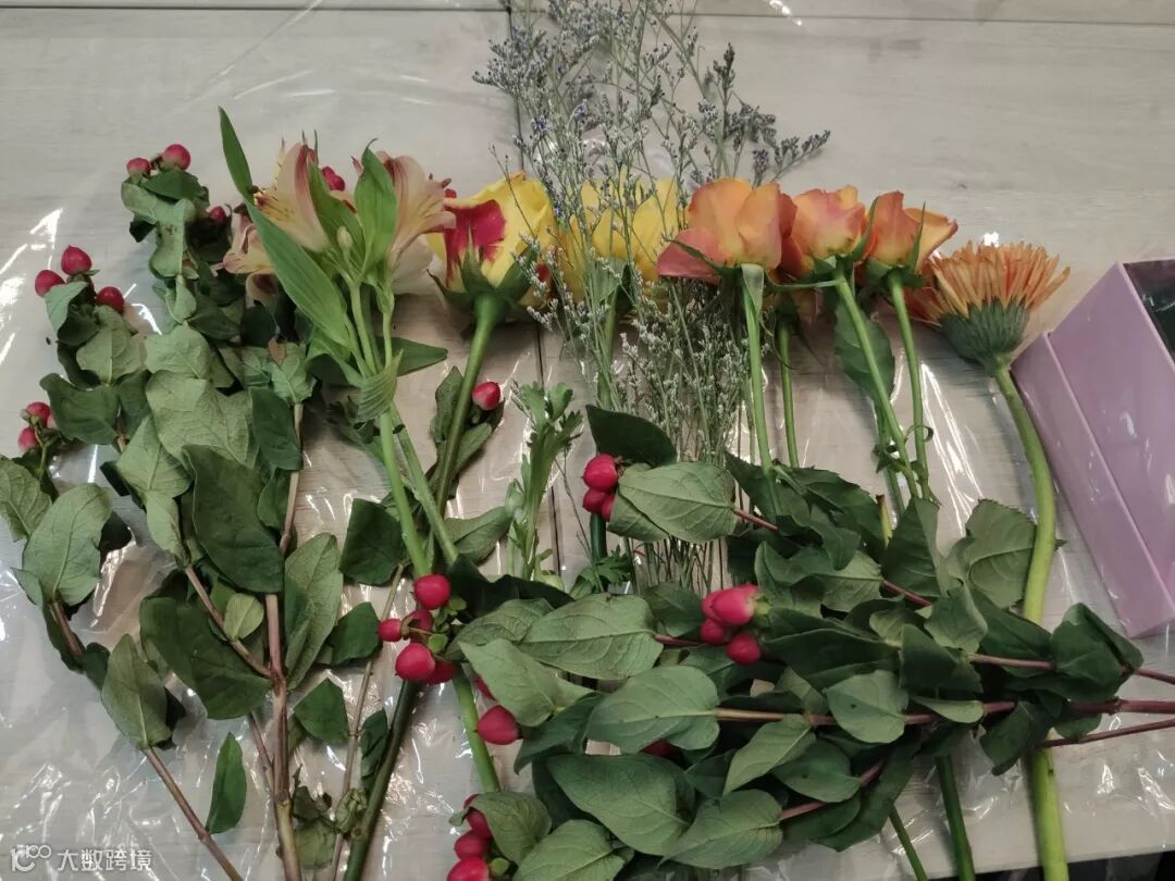 各种缤纷的花材在园区企业家的手里