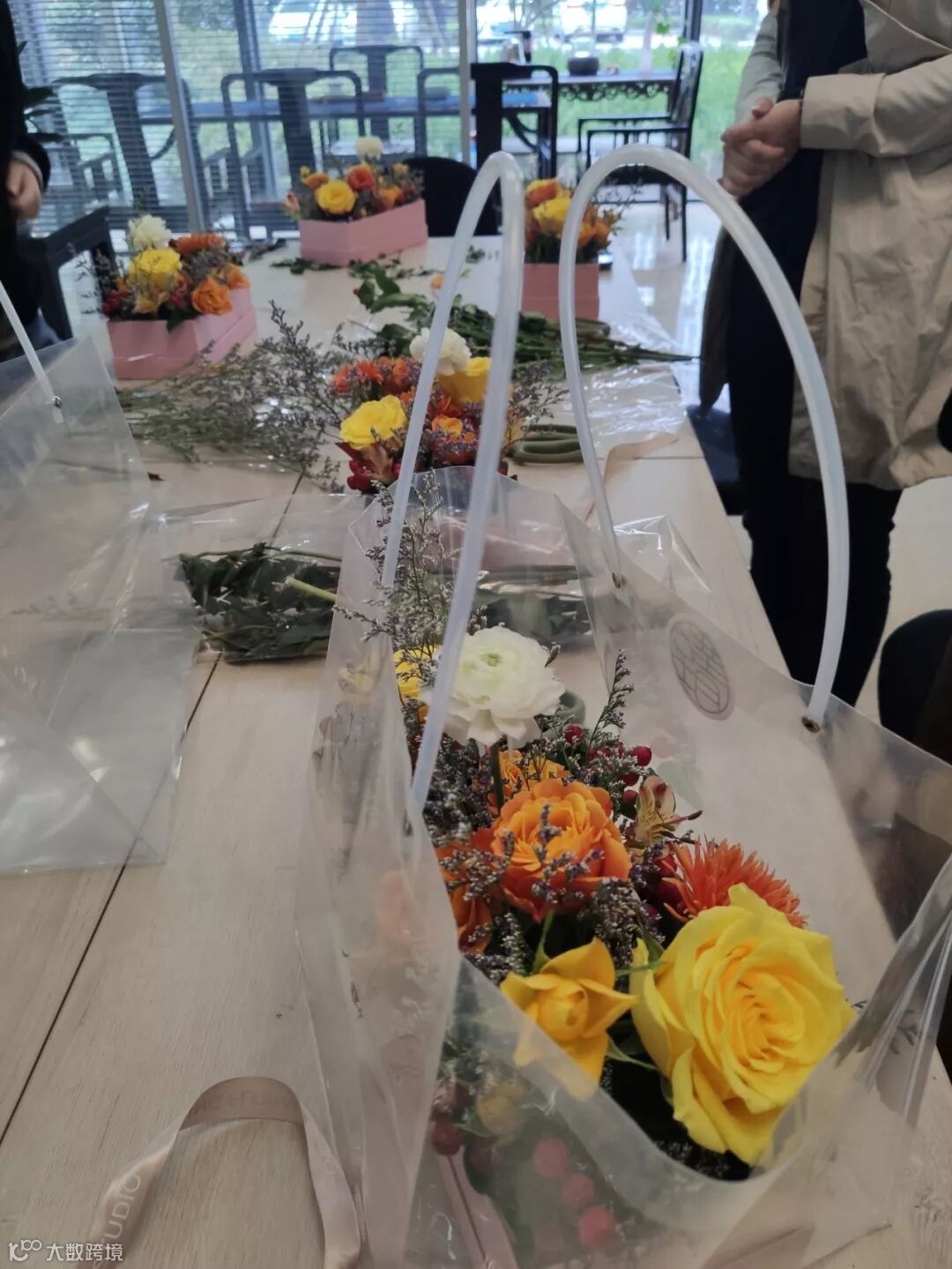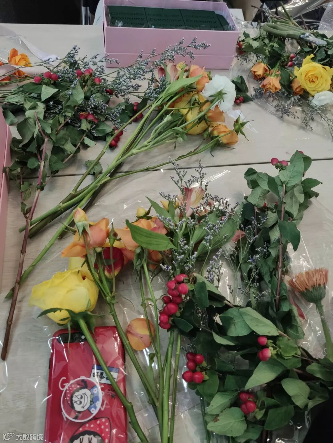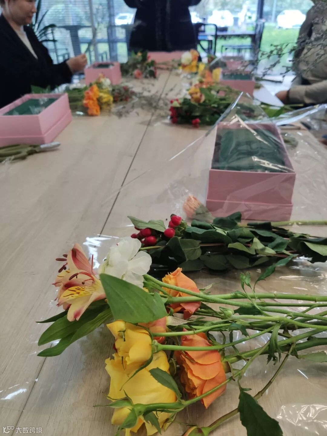 各种缤纷的花材在园区企业家的手里