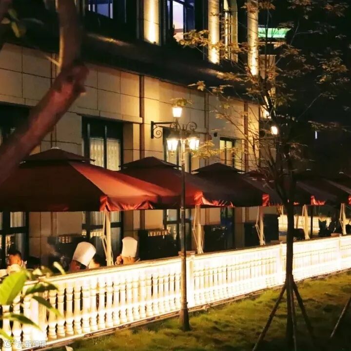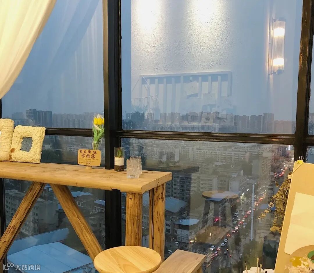 暖黄的灯光、落地窗的咖啡卡座