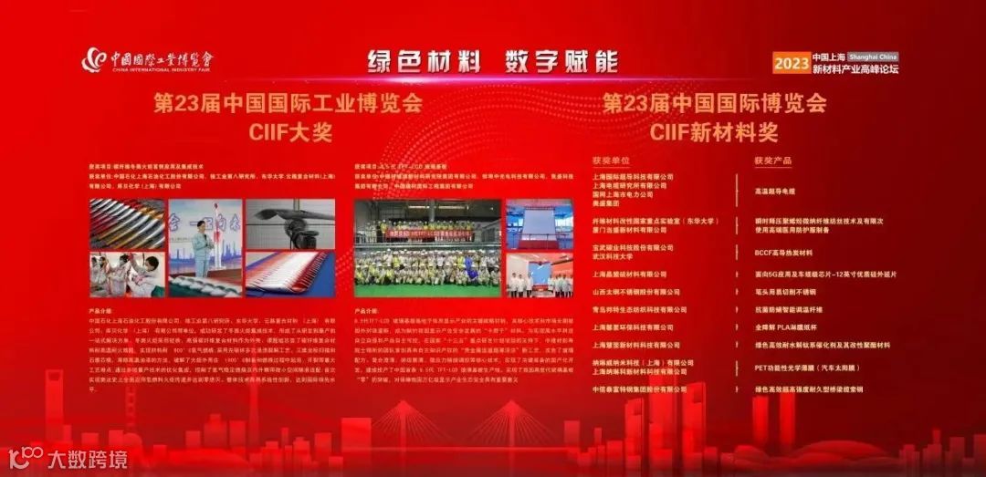 2023年9月,第23届中国国际工业博览会重点活动——“2023中国•上海新材料产业发展高峰论坛”在上海国家会展中心举办。会上颁发了2项新材料领域“CIIF大奖”和10项“CIIF新材料奖”,8.5代TFT-LCD玻璃基板和碳纤维冬奥火炬首创应用及集成技术获得“CIIF大奖”,高温超导电缆等10项产品获得“CIIF新材料奖”。第23届中国国际工业博览会“新材料、新技术、新产品发布会”上颁发了“第23届中国国际工博会新材料专业展优秀产品奖”,上海甘田光学等17家单位获奖。