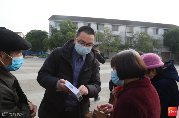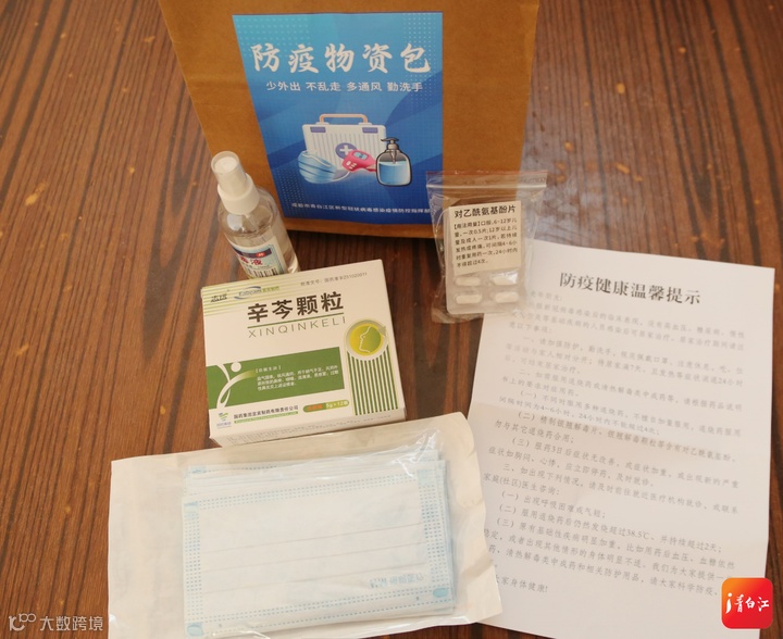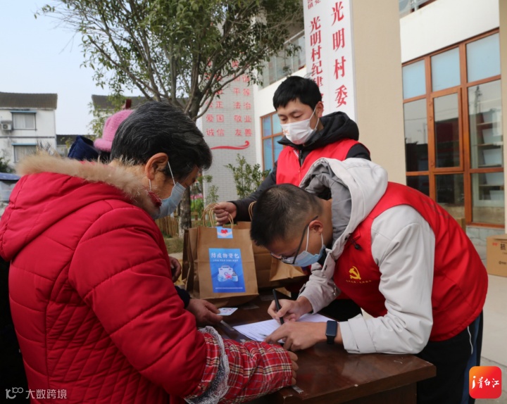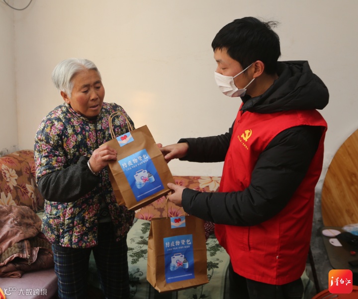 在姚渡镇光明村村委会门口,收到“防疫物资包”的大爷大妈们喜笑颜开。“我感冒药都没有准备,这个‘防疫物资包’很及时。”张爷爷觉得很暖心。