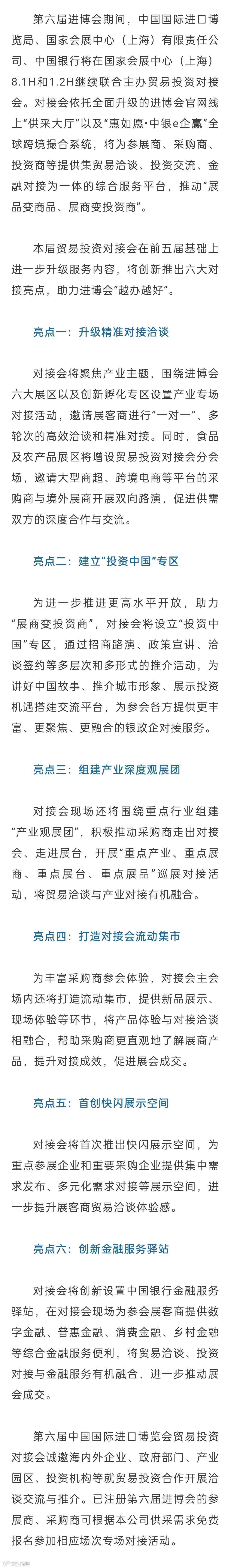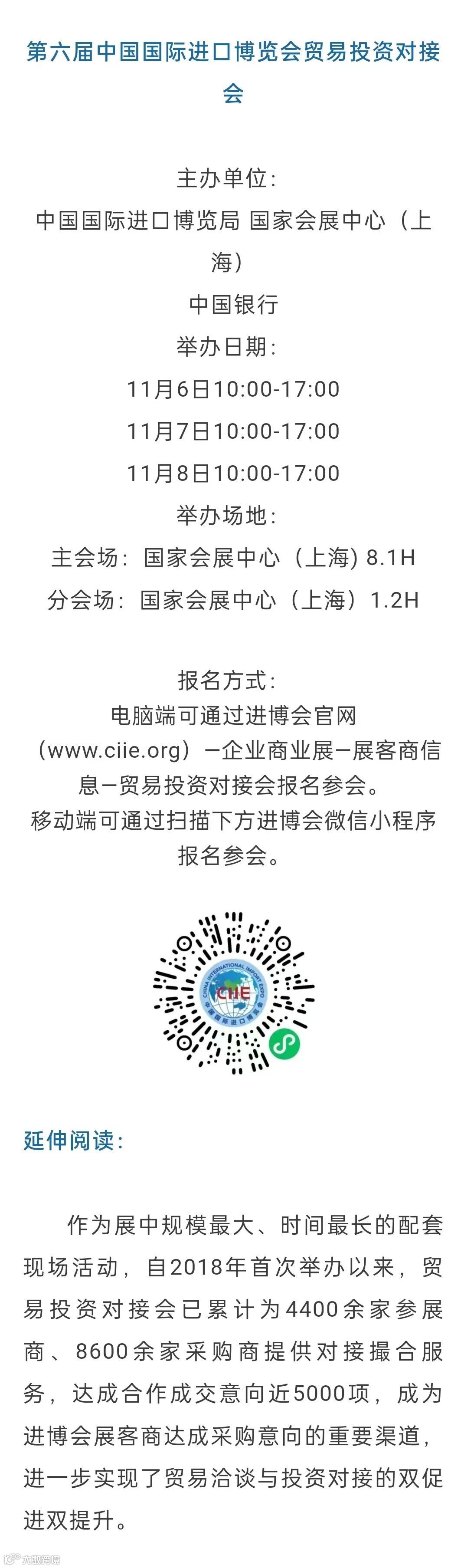 导读:配套活动抢先看丨第六届中国国际进口博览会贸易投资对接会