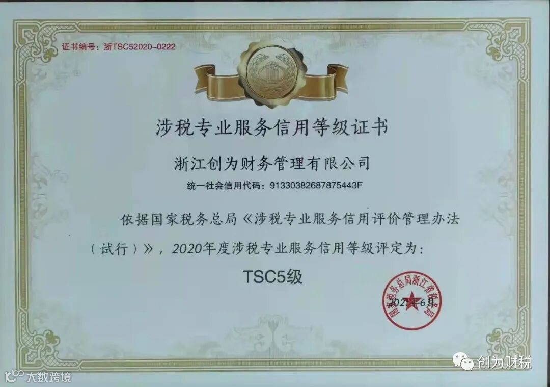 2021年10月28日,浙江省税务总局发布了2020年度浙江省TSC5级涉税专业服务机构信用等级名单。浙江创为财务管理有限公司成为首批获得省级TSC5等级涉税专业服务单位之一!