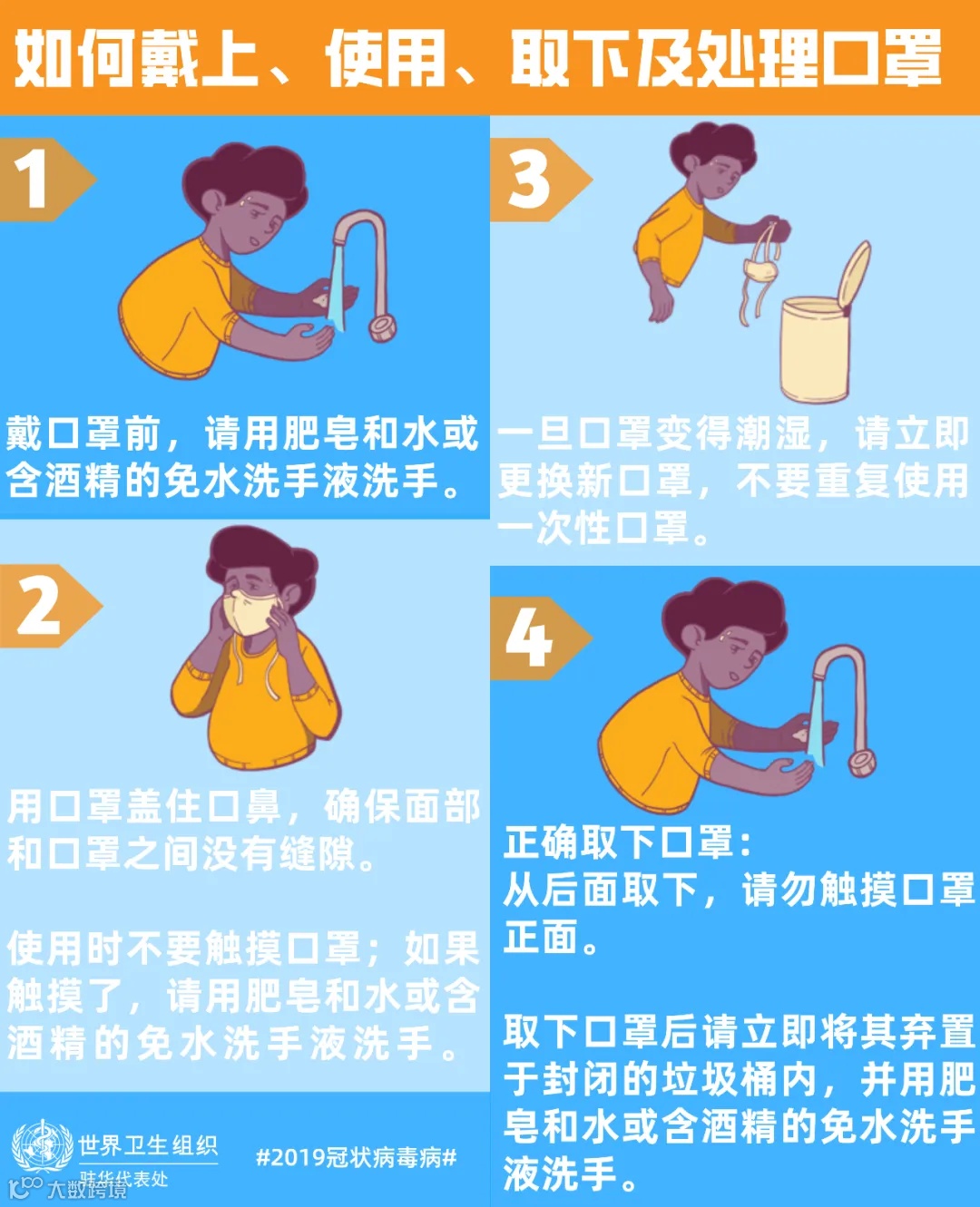 取下口罩后请立即将其弃置于封闭的垃圾桶内,并用肥皂和水或含酒精的免水洗手液洗手。