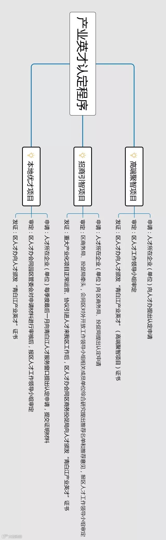 在申请人才政策上,欧洲产业城管理委员会建立人才服务专员制度,对重点人才(团队)项目,提供“一对一”人才专员服务。认定程序如图:
