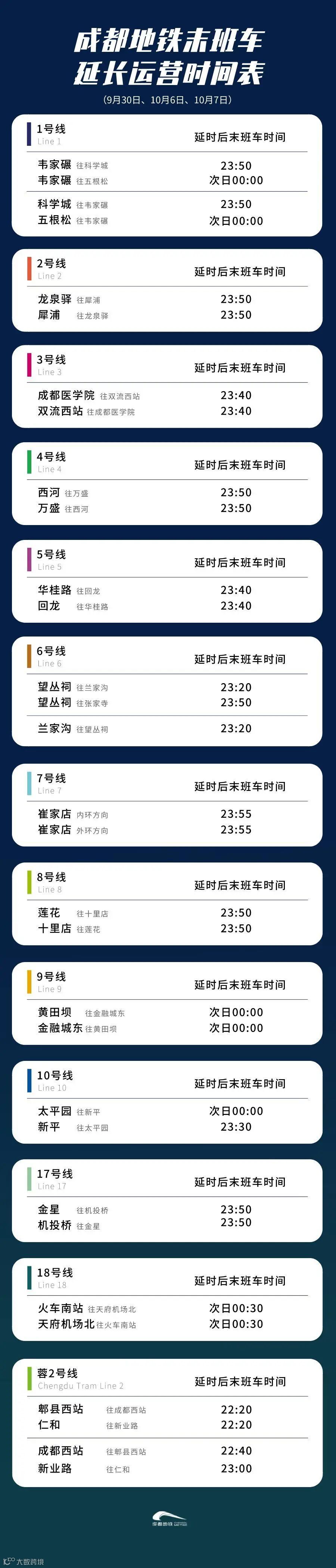 今天,成都地铁各线路延时运营50-60分钟,服务热线028-61638000也同步延时。乘客可通过地铁电视、成都地铁APP、官方微信、微博、站内告示等途径,了解延时服务信息 。详细时刻表戳下图↓