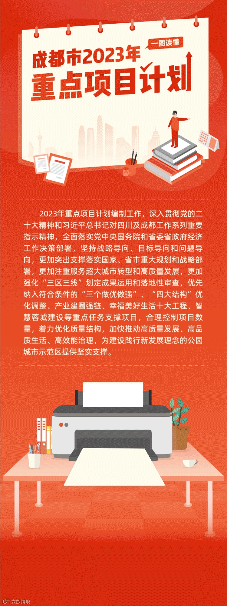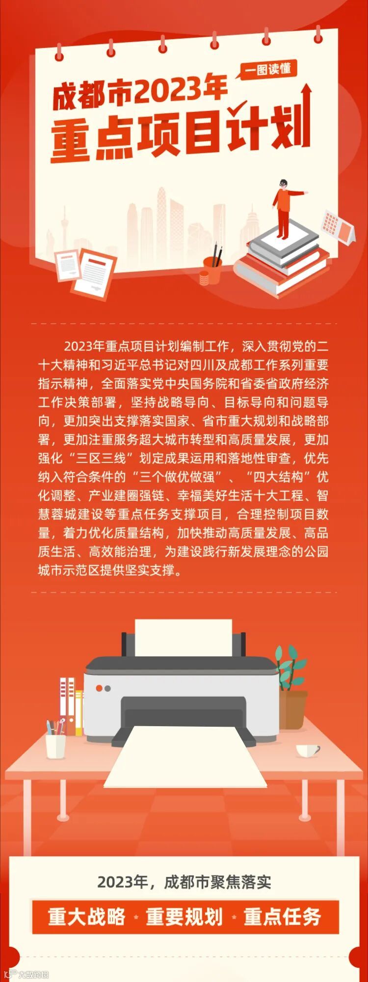 成都市发改委相关负责人表示,《成都市2023年重点项目计划》是今年市政府的一号发文,比往年印发时间提前足足一个月,显示了成都“开局就是决战,起步就是冲刺”的拼经济的劲头,将在全市掀起大抓项目的热潮。