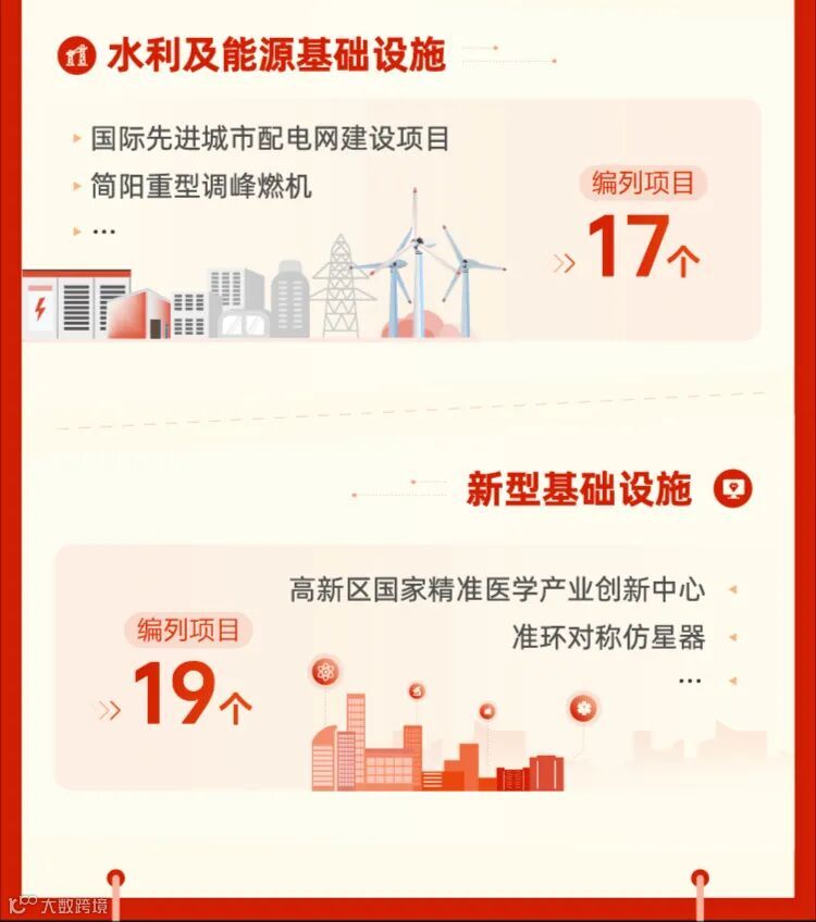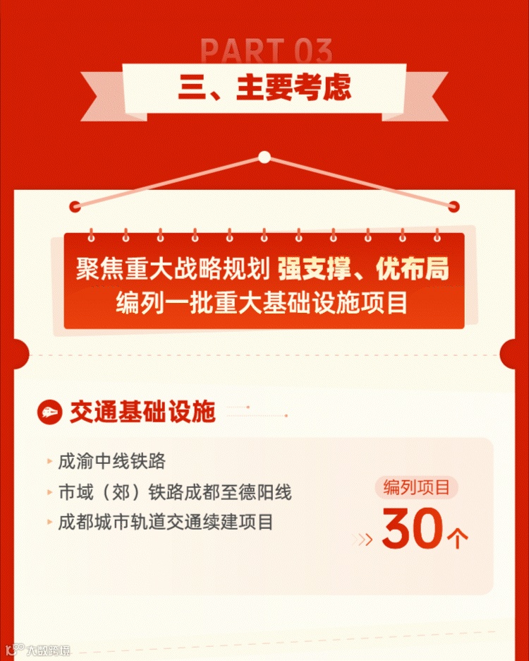 ● 交通基础设施方面,继续编列成渝中线、市域(郊)铁路成眉线、成德线、资阳线、城市轨道交通等项目30个,新增成渝高速公路扩容、成温邛高速扩容等开工或储备项目17个。