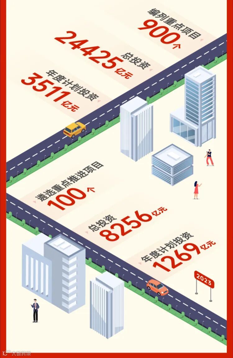 2023年100个市级重点推进项目,总投资8256.4亿元,年度计划投资1269.3亿元。