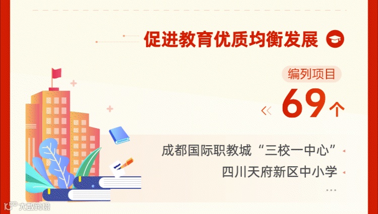 ● 促进教育优质均衡发展,实施成都国际职教城“三校一中心”、四川天府新区中小学建设等69个项目。