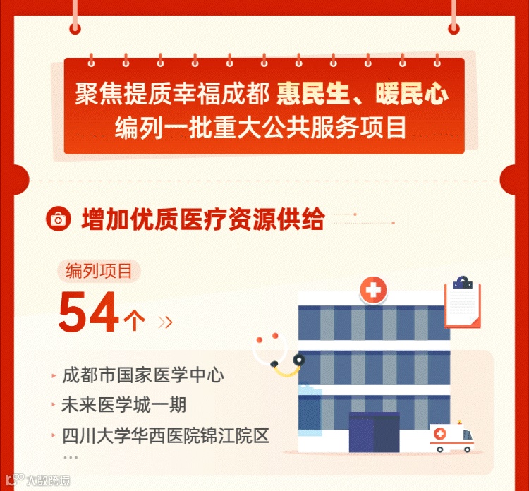 ● 增加优质医疗资源供给,实施成都市国家医学中心、未来医学城一期、四川大学华西医院锦江院区等54个项目。
