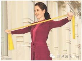 把弹力带绕过后背,双手握紧带子放在身体前方与胸膛同高,掌心向下,手肘弯曲。重复伸直和弯曲手肘15到20次。