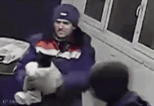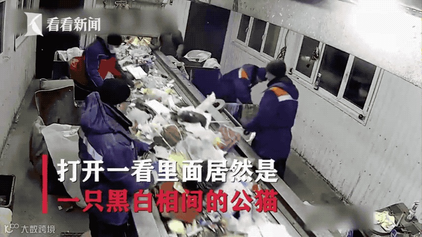 抱着猫的工人一脸地不敢相信,并对着其他人无奈地摇了摇头…