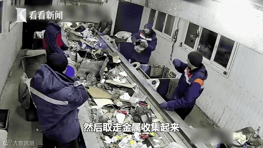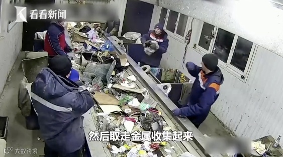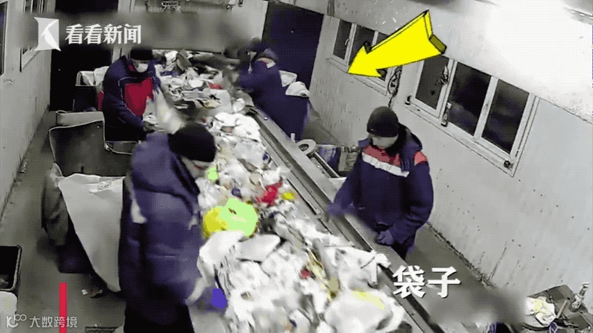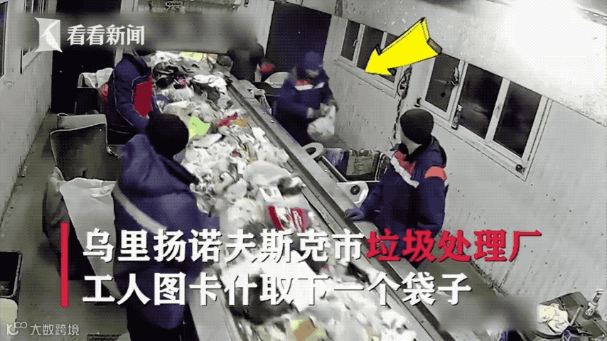一个白色的塑料袋在机器轮子上慢慢地往前面推,当过了第一个员工的位置时,他并没留意这个白色的袋子,而是挑起了旁边的垃圾袋。