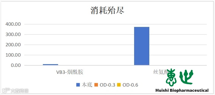 VB3和丝氨酸在扩大培养--OD0.3这一阶段,已经消耗殆尽。后续可以根据此信息,进行发酵补料,提高产率。