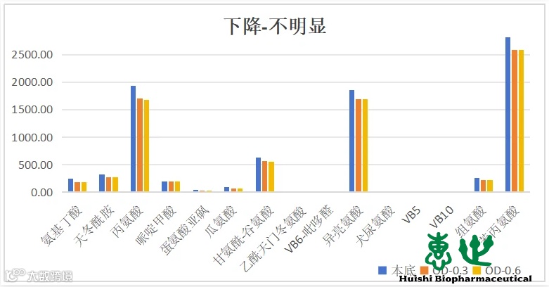 丙氨酸、异亮氨酸、组氨酸、VB5等15种氨基酸及维生素在发酵过程中初始培养--OD 0.3这一阶段持续下降;从OD0.3--OD0.6这一阶段,虽然细胞数量翻倍,但是这阶段这些物质基本无变化或者略微降低。