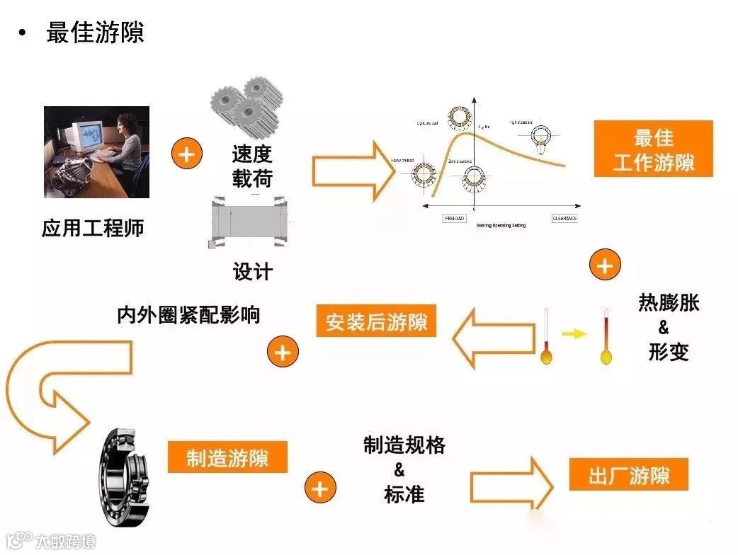 最佳工作游隙的选择是由应用工况(载荷、速度、设计参数)和期望得到的工作状态(最大寿命、最好的刚度、低的热量产生、维护的便利等等)决定的。然而,在大多数应用中,我们无法直接调整工作游隙,这就需要我们根据对应用的分析和经验,计算出相应的安装后游隙值。