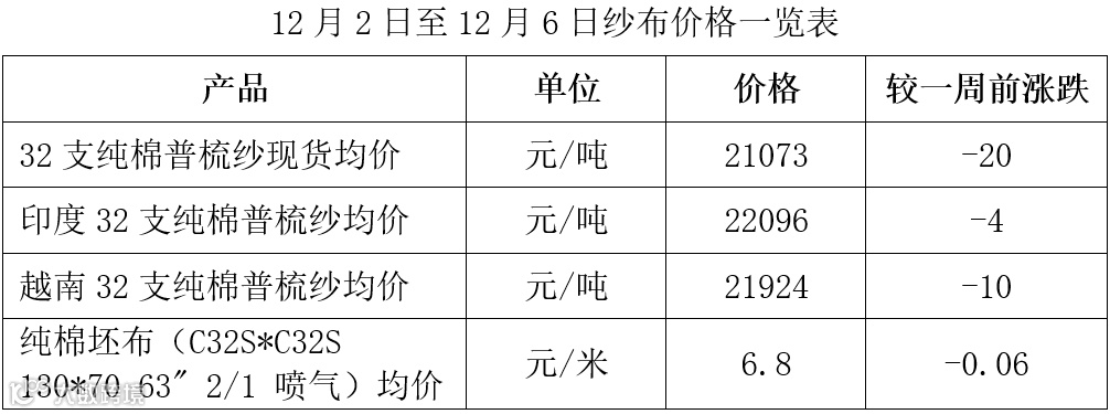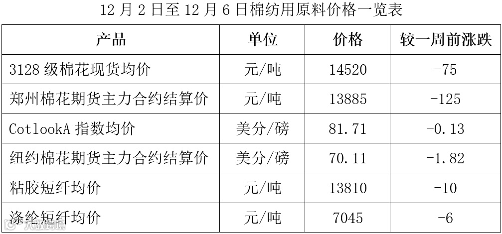原料端:国内外棉花价格下降,粘胶短纤价格略有松动,涤纶短纤价格震荡偏弱。产品端:国内外棉纱价格稳中偏弱,坯布价格下降。