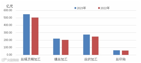 据国家统计局统计,2023年,540家规模以上丝绸企业营业收入同比增长9.01%,利润总额同比增长40.81%。其中,缫丝加工营业收入同比增长7.43%,利润同比增长122.85%。丝织加工营业收入同比增长11.05%,利润同比增长31.92%。丝印染加工营业收入同比增长5.81%,利润同比下降9.22%。丝绸行业规模以上企业营业收入增速较2022年提高12.41个百分点,利润增速提高了60.53个百分点。