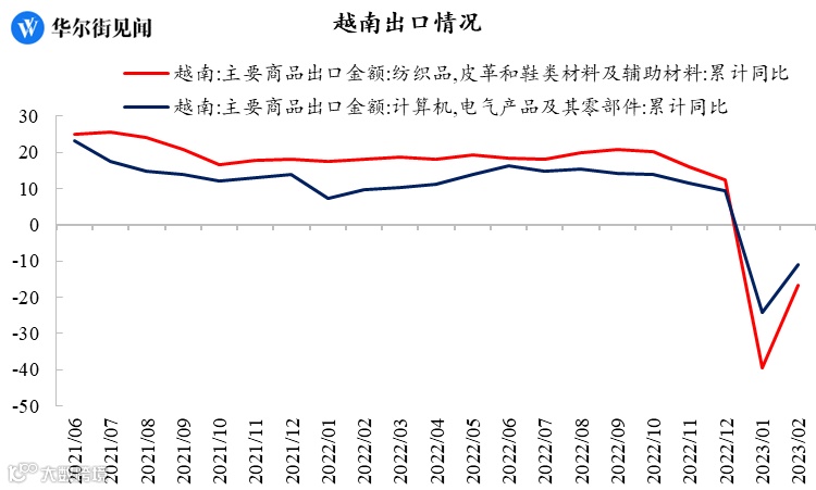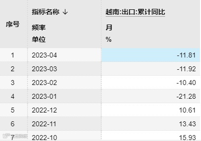 2023年第一季度,越南的出口额约791.7亿美元,同比下降11.9%(纺织品和鞋类订单下降70%-80%,电子产品出货量也同比下降10.9%)。