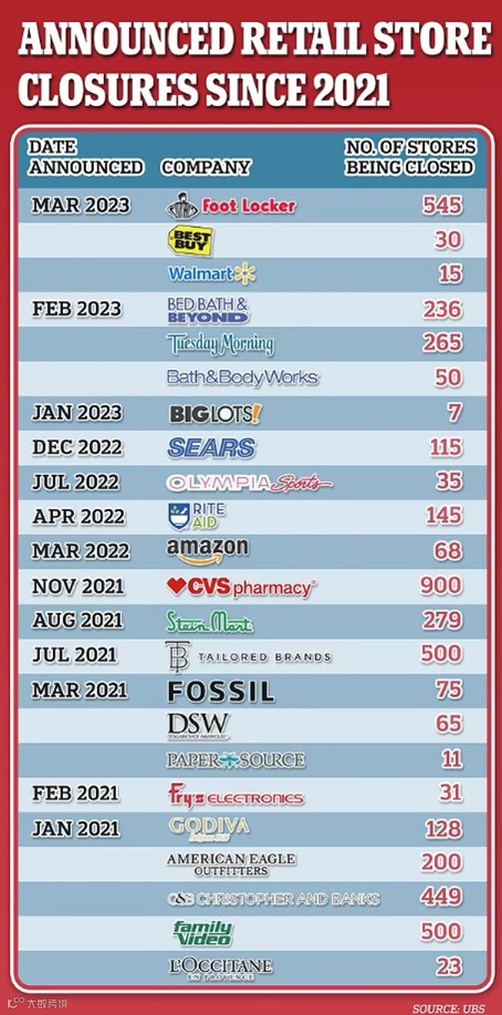 自 2021 年以来,Target、Best Buy、Sears、Foot Locker 和 CVS 等主要品牌的近5000家店面已经在全国范围内关闭,投资银行瑞银预计到2027年将有50000家商店关闭。