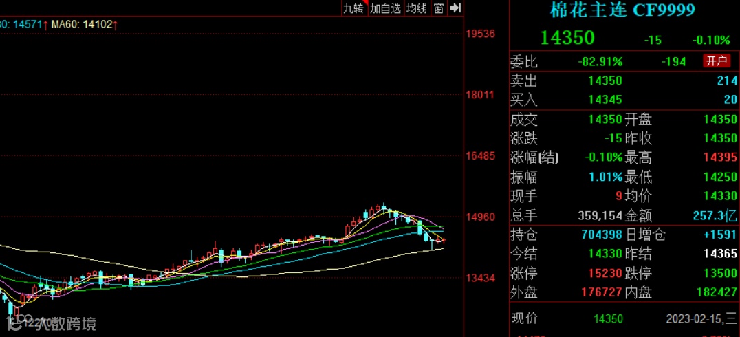 2月16日,郑棉主力合约窄幅震荡,收于14350元/吨,跌15元/吨。ICE棉花破位下行,对美联储将进一步加息的担忧,令海外金融市场整体风险偏好下降。国内市场上,金三银四传统需求旺季将临,良好预期能否兑现还需等待下游后续表现以验证。