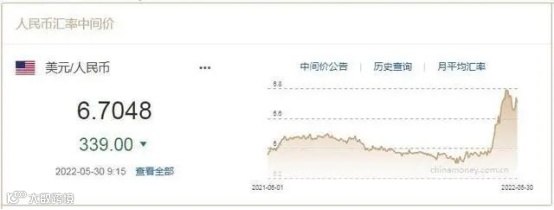 5月13日,在岸人民币对美元汇率跌破6.8,为2020年10月份以来首次,最低下探至6.815,随后震荡上行。截至5月23日,离岸人民币对美元汇率盘中升破6.6479,随后亦震荡回升走贬,5月25日、26日两个交易日再度贬值超1000个基点。