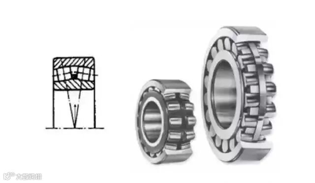 该类轴承在球面滚道外圈与双滚道内圈之间装有球面滚子,按内部结构的不同,分为R、RH、RHA和SR四种型式,由于外圈滚道的圆弧中心与轴承中心一致,具有调心性能,因此可自动调整因轴或外壳的挠曲或不同心引起的轴心不正,可承受径向负荷与双向轴向负荷。