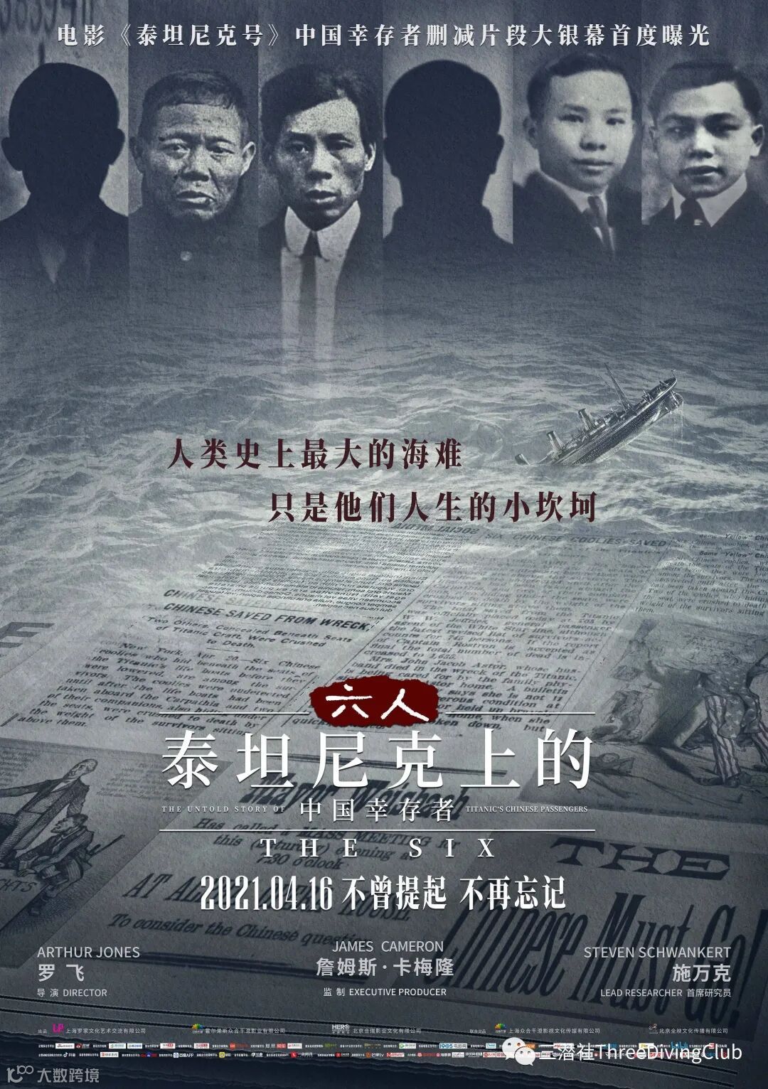 由罗飞执导、好莱坞殿堂级导演詹姆斯·卡梅隆担任监制、首席研究员施万克讲述的纪录电影《六人-泰坦尼克上的中国幸存者》(以下简称《六人》)恰逢4月16日2021DRT开幕当天在中国大陆上映。
