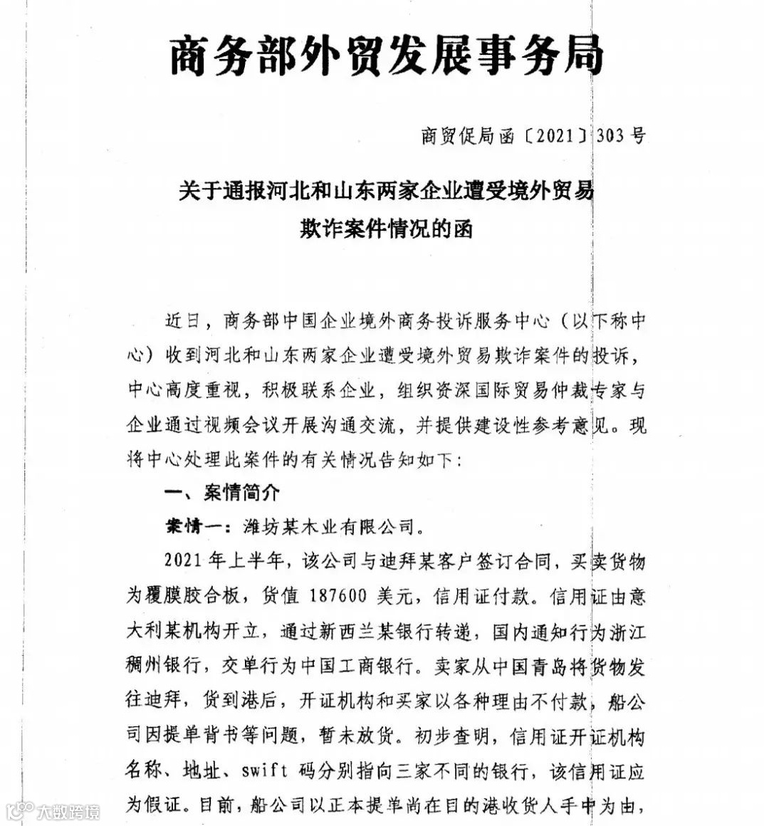 近日,商务部中国企业境外商务投诉服务中心(以下称中心)收到河北和山东两家企业遭受境外贸易欺诈案件的投诉,现将中心处理此案件的有关情况告知如下: