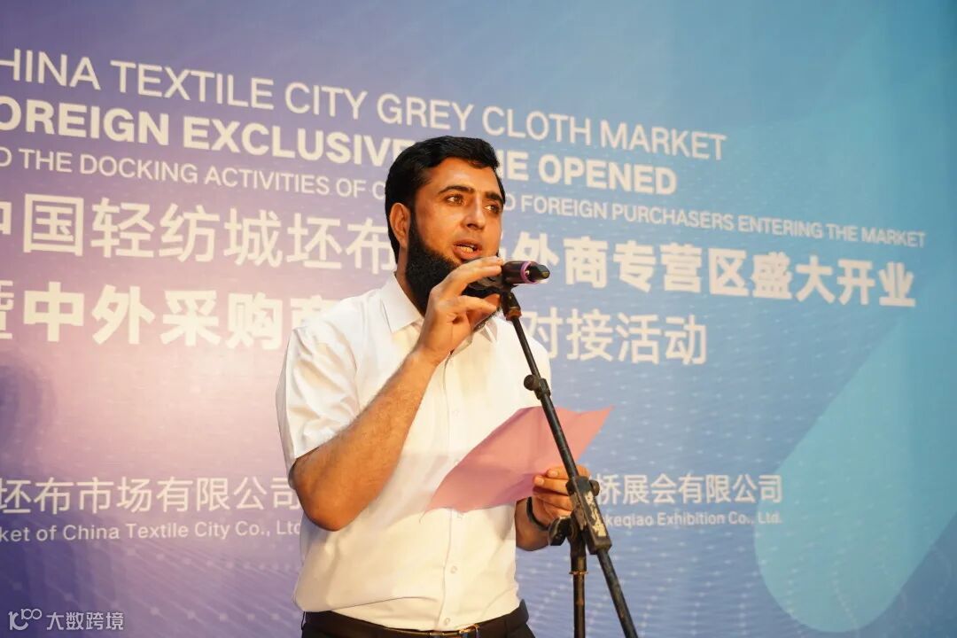 上午十点,开幕仪式正式启动,坯布市场负责人王华军、巴基斯坦商会会长阿卜杜拉分别做开场致辞,向到场的中外客商表达了热烈欢迎,并对即将开业的外商专营区表示了期待和信心。
