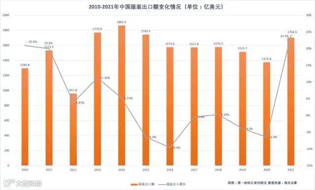 疫情下全球供应链危机给中国纺织业带来了大量的回流订单。据海关总署统计,2021年全国纺织品服装出口3154.7亿美元(该口径不含褥垫、睡袋及其他寝具),同比增长8.4%,创历史性新高。其中,服装全年出口1702.6亿美元,同比增长24%,在外需恢复和疫情导致的订单回流等利好因素下,时隔五年,中国服装出口再次站上1700亿美元的关口。