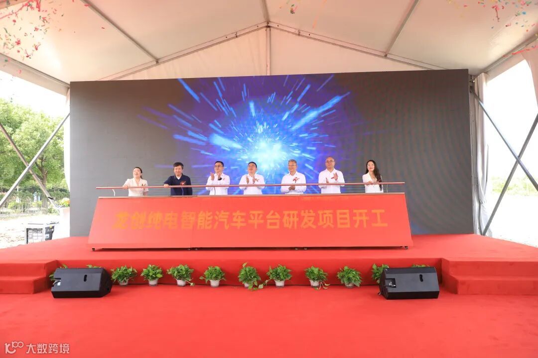 活动现场,伴随着礼炮声和机器轰鸣声,龙创纯电智能汽车平台研发项目开工。