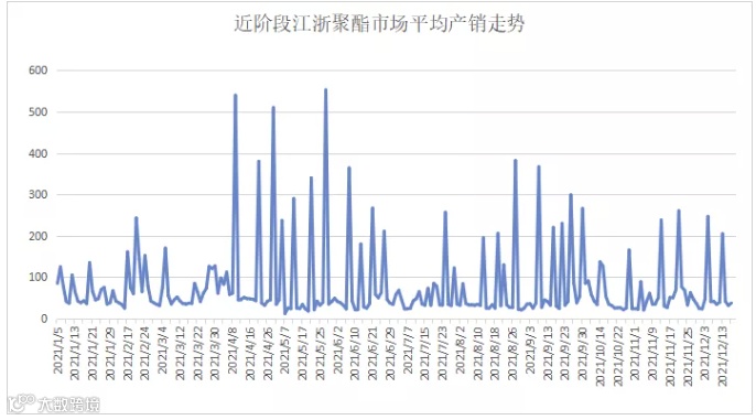 近一月以来,涤纶长丝市场各产品价格重心直线下滑,跌价已然成常态,自从十月底开始进行的涤丝促销转眼间已经经过了两个月的时间,聚酯工厂想要提高销量只能靠不停的吆喝促销来达到目的,甚至在不少时候促销都没有人愿意买账,但是最近促销的作用似乎比11月时来的有用,从江浙聚酯产销走势图上可以看到,涤丝产销整体呈现脉冲式的走势,产销以一日冲高为主,而12月份以来产销一日游的都与促销的日子刚好吻合。这让织造企业大都选择按需采购的购买策略,等待涤丝价格再度下滑。