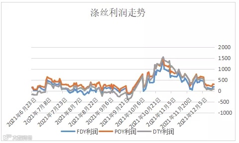 同样不可忽视的是,12月以来市场虽表现相对平稳,但一直未能有突破,因此当价格再度跌入低区间值时,市场抄底心态也变得十分敏锐。据了解,目前随着上游原料的逐渐企稳,涤丝利润又回到了低位区间,从十月破千的利润回落至现在出现两位数,截止12月17日常规规格的涤丝利润分别在:150D FDY利润为178元/吨、150D POY利润为308元/吨、150D FDY利润为78元/吨。下游及贸易商或可能因此在月底迎来逢低适度补仓。