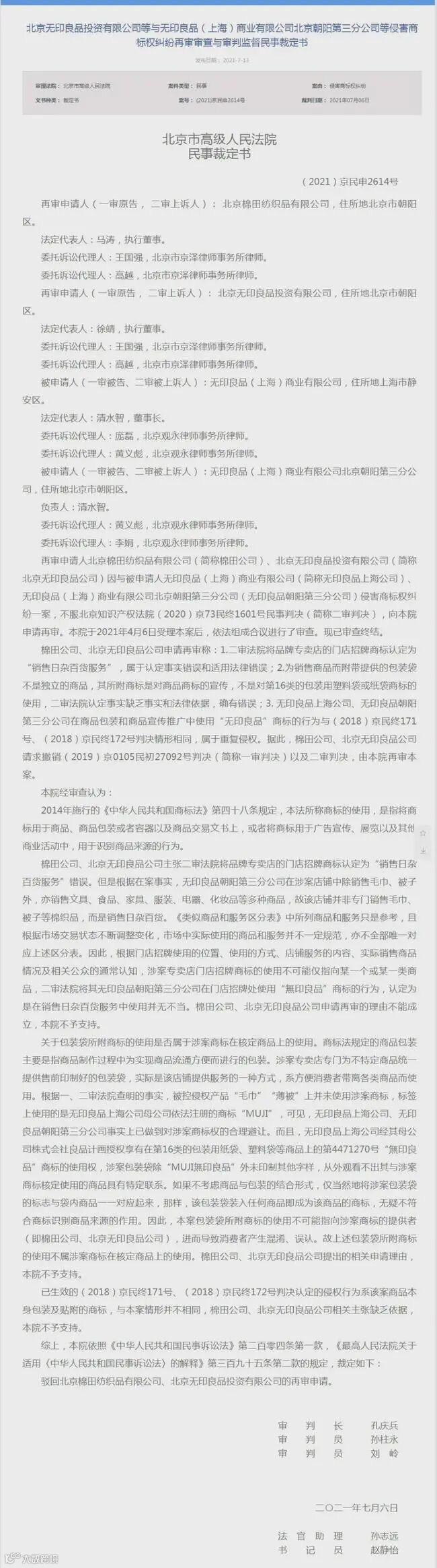 北京市高级人民法院最终驳回了北京无印良品的再审申请。
