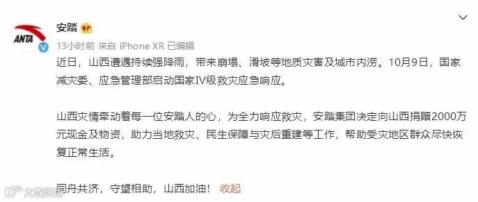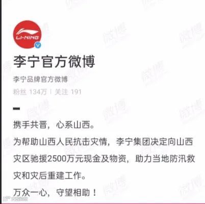 又是鸿星尔克!低调向山西灾区捐赠2000万!李宁、安踏、特步也出手了