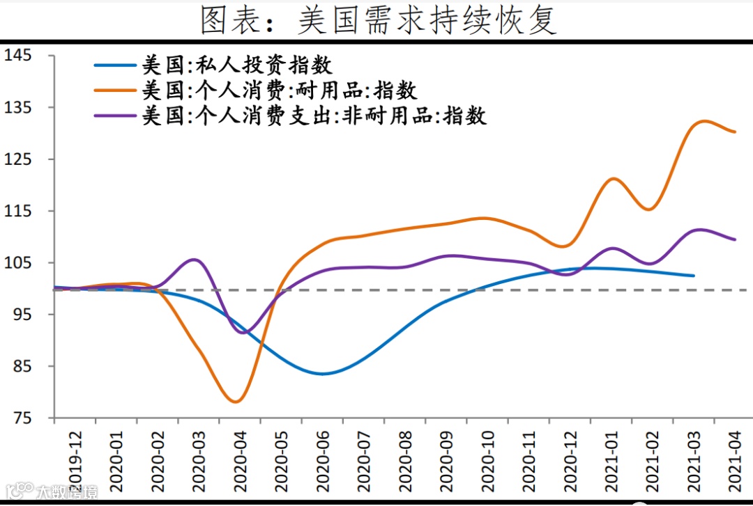 美国供需缺口逐渐收窄,耐用品库存持续上升。受益于拜登1.9万亿美元刺激计划,需求加快恢复,美国商品消费创新高;