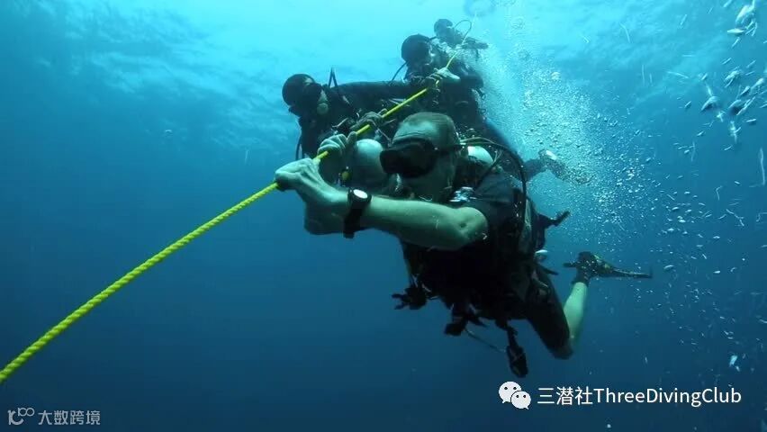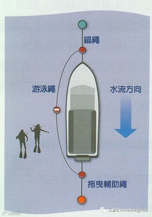 关注简报。如果水面有水流,船员们会有具体的布置,包括抓住标记绳,这样你们就可以一起下潜。这些绳索从船尾拖出。切记,即使是暂时的松手,也可能导致被冲走。在水流非常湍急的情况下,必须顺着系泊绳下行,这些绳索或者沿着船的一侧,系在系泊绳或锚绳上,或者系在标记绳上,通向潜点。