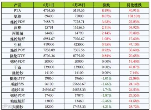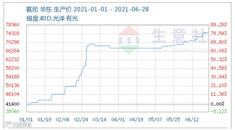 而另外一个化纤原料氨纶市场6月份快速拉涨,截至6月29日价格在75000元/吨,较月初上涨8.07%,同比涨幅138.10%,攀升至10年新高。