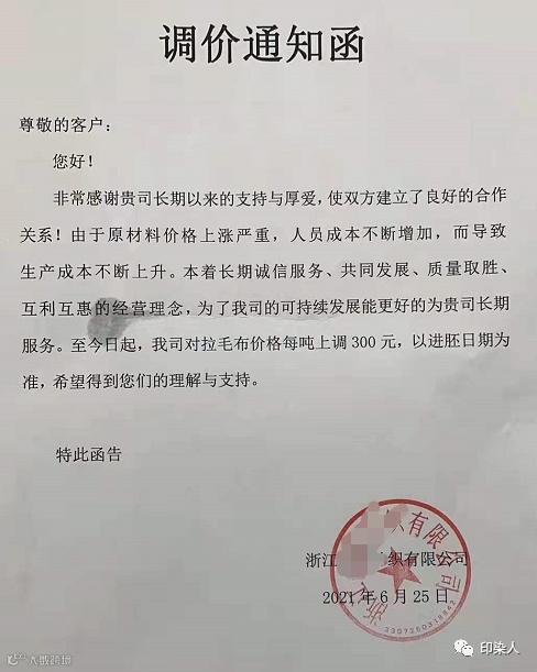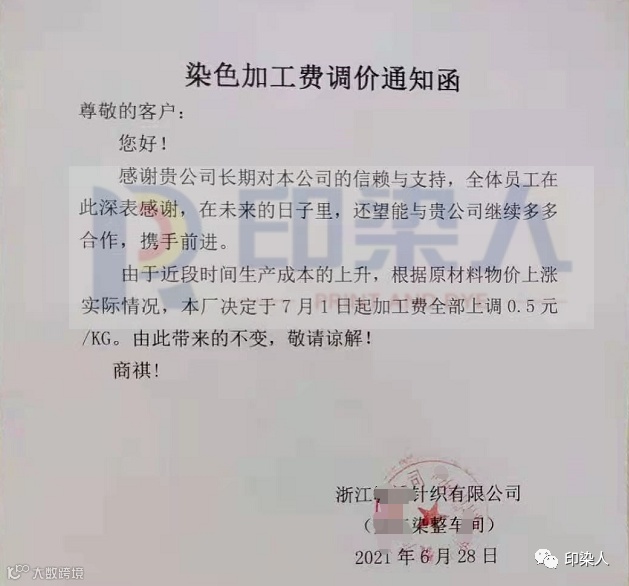 浙江印染厂连发两张通知函,即日起每吨染费上调500元!