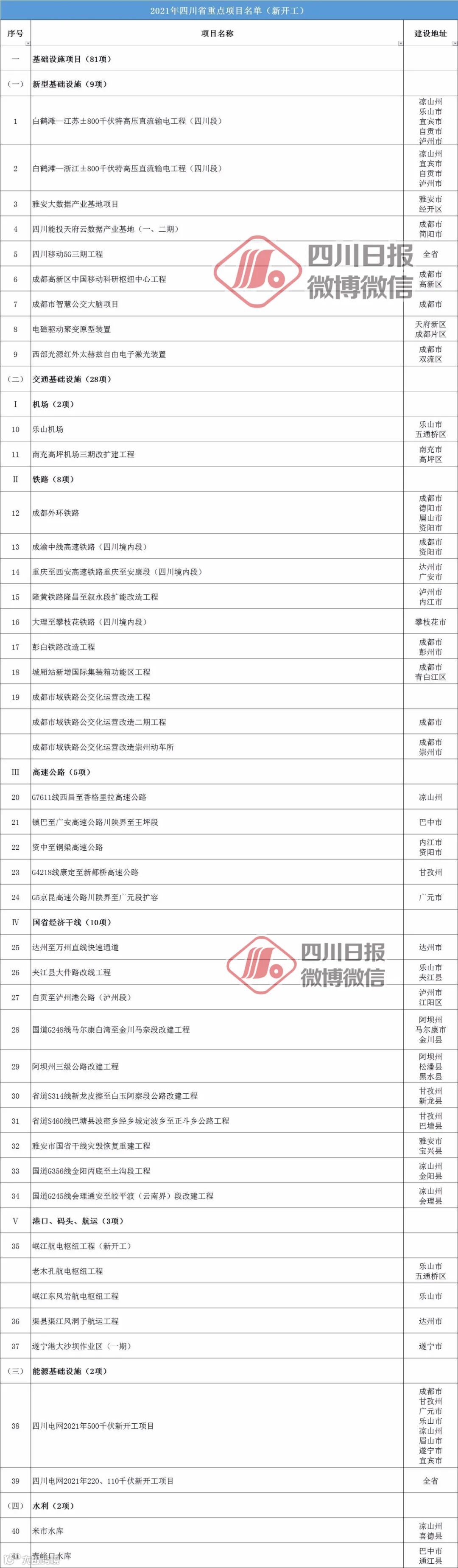 2月4日,记者从四川省发改委获悉,2021年四川将新开工211个重点项目,包括81项基础设施项目、99项产业项目、25项民生工程及社会事业项目和6项生态建设及环境保护项目。