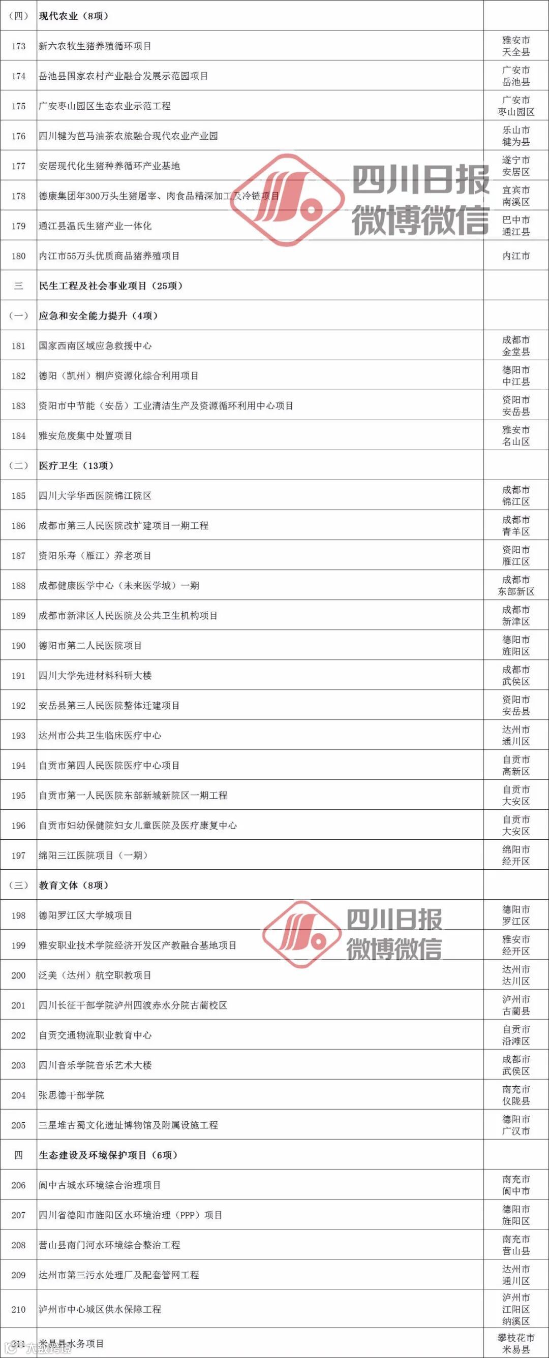 此外,还有这些项目也值得我们特别关注:雅安大数据产业基地项目、宜宾市筠连县高铁站基础设施项目、绵阳科技之心片区产城融合项目、自贡航空产业园通用航空产业综合示范区项目、四川大学华西医院锦江院区等重点项目。