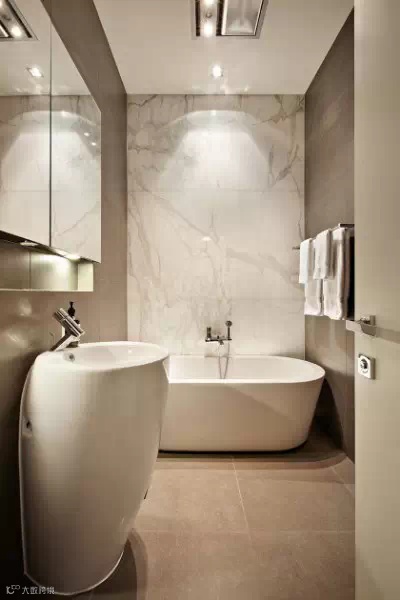这个小巧玲珑的大理石浴室非常的宁静,浴缸跟淋浴被搬到了一起,大理石是它们的重点材料,巧妙的是设计师利用大理石创造一种放松和安宁的氛围。