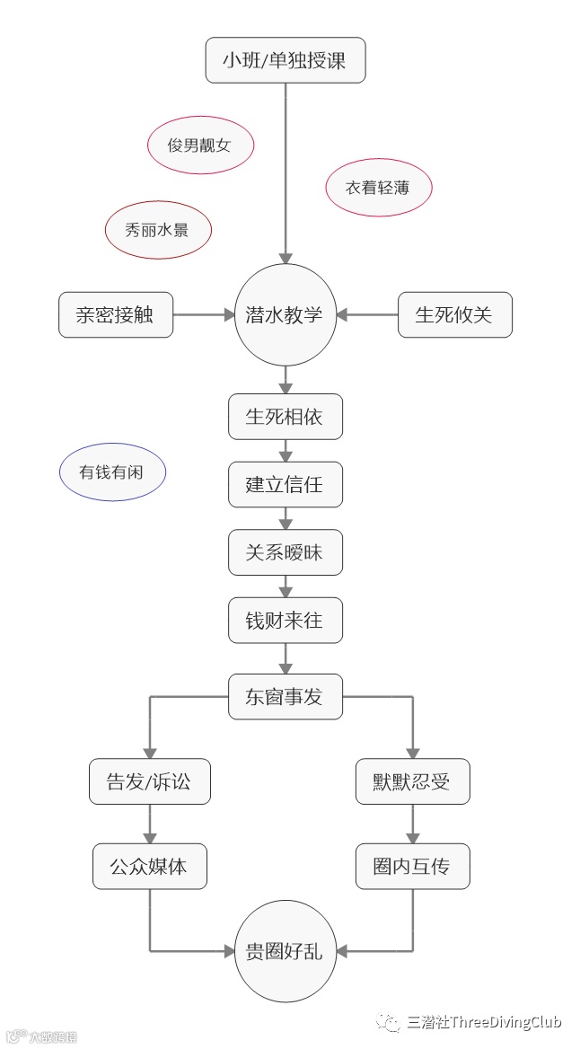 环境造就的现实无法回避,出于对学员的考虑,避免最糟糕的水下恐慌是所有潜水教练第一要务,因此在教学过程中的关怀和安慰并非是个别教练的习惯,而是潜水教学手册所倡导的概念,如同护士的关心会让患者造成误解,很多时候双方对度的把握失控会导致尴尬的局面,久而久之,一部分的教练在教学经验有了相当累积之后知道如何去拿捏这个分寸,而又有一部分教练却看到了另一面 - 阴暗而利益的敲门砖。