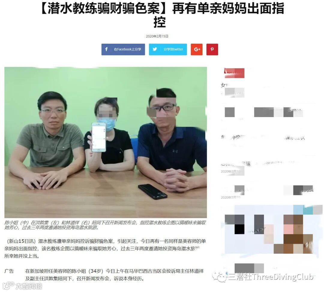 最开始的2月13日,新闻发布会,一位单身母亲称自己被一位潜水教练骗财骗色了。事情经过大致是2018年3月8日通过FB认识的潜水教练称有意开设一家潜水美容院后两人陷入恋情并共同投资,直至2019年1月24日,她发现恋人的FB上和一名交往8年的女友结婚了!