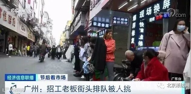 据央视财经报道,在务工人员流入的大省广东,每年春节一过,各大招聘市场就会人头攒动。而今年,在服装加工厂林立的广州康乐村一带,招聘市场上则出现了老板排长队等着被挑的场景。