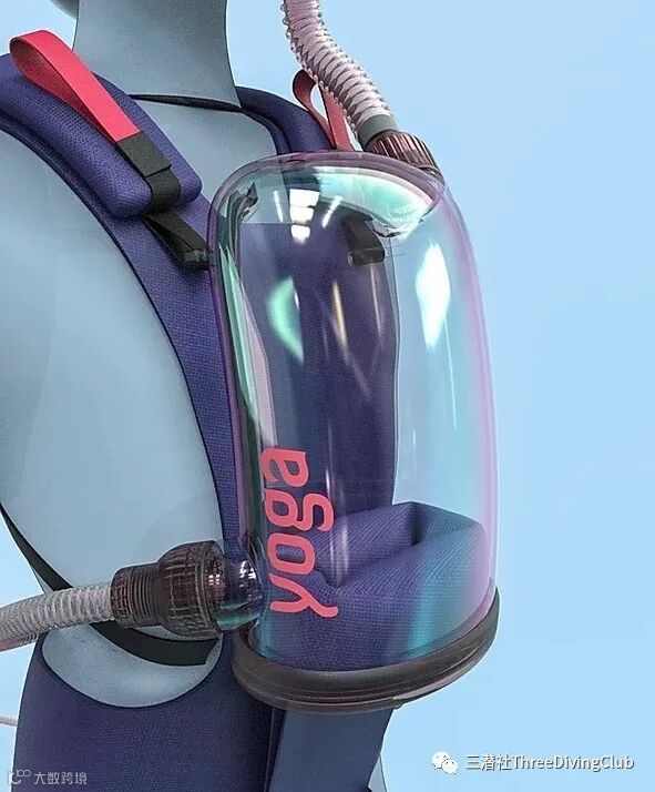 那么解决正压力的问题就好了,老外的想法很别致,这个名为Exolung的装置就此诞生了,通过呼吸管一样的装置,在胸前继承了类似医院里的呼吸辅助设备,施以动力将压力打进去来实现这个功能。