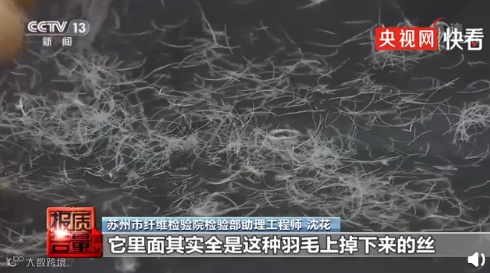 苏州市纤维检验院检验部助理工程师 沈花:它的标签,它的含绒量是80%的白鸭,但实际上我们抽到了它的含绒量只有1.7%,那它里面其实全是这种羽毛上掉下来的丝,正常我们的羽绒呢应该是这样子的绒朵,很大朵的,然后这样才能隔绝空气保暖,这几乎是我从业以来检测过的最差的羽绒服了。